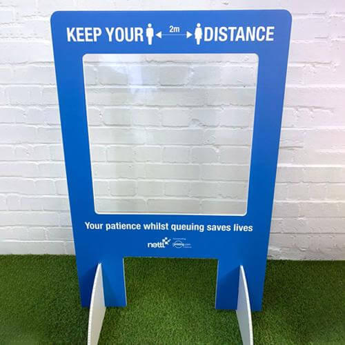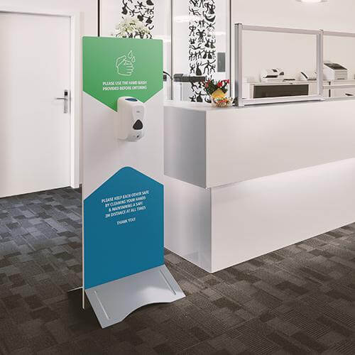 Printed in full colour on one (or both) sides with your branding or specific hygiene message. Freestanding, counter top and wall mounted variations are available.